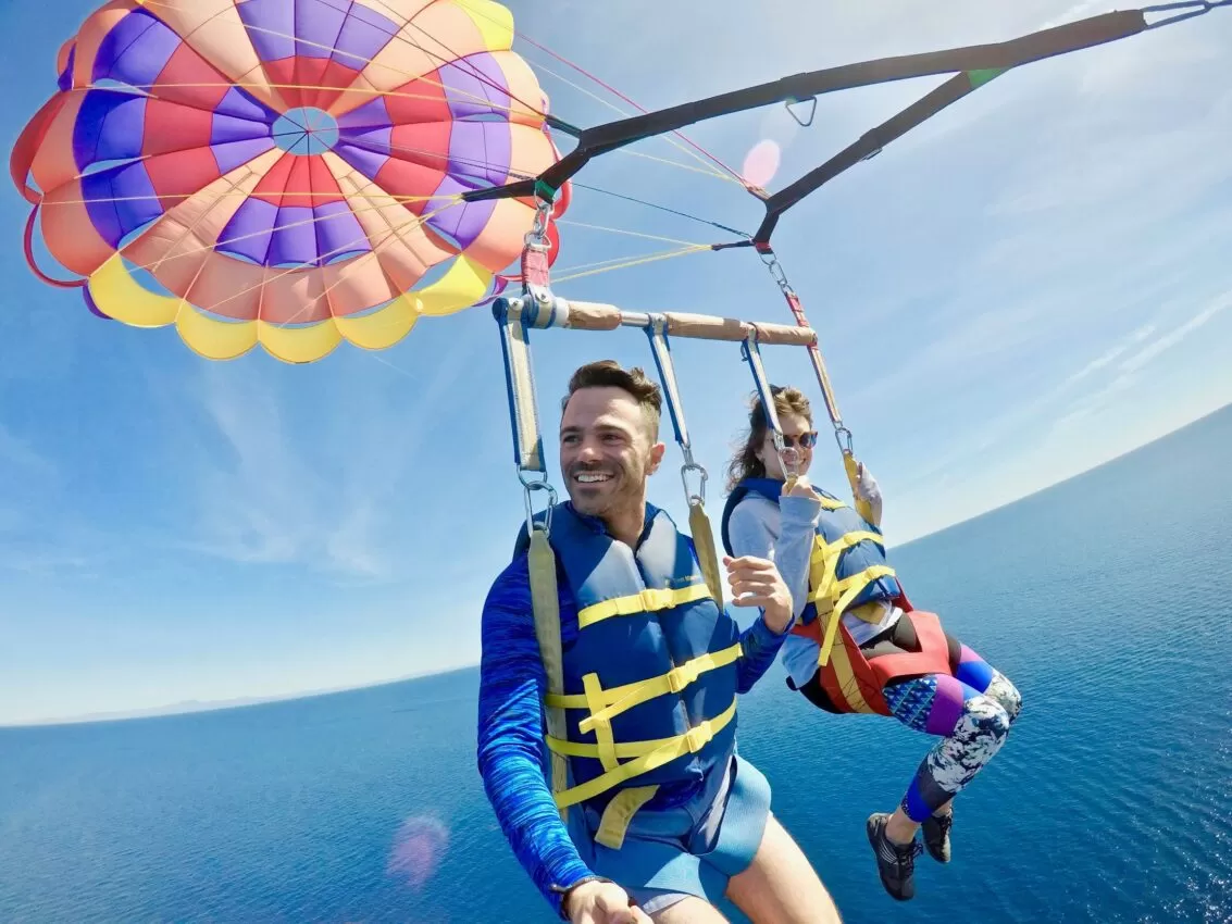 Парасейлинг — это полёт под парашютом, который буксирует катер. Турист поднимается на высоту от 50 до 150 метров, наслаждаясь панорамным видом на побережье.